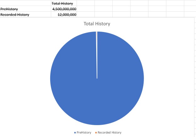 This White line is the time that we recorded history ,the Blue area is Pre History. So comparatively, it’s like explaining your whole life by the last 30 seconds and of course convincing everyone that you had it all figured out .